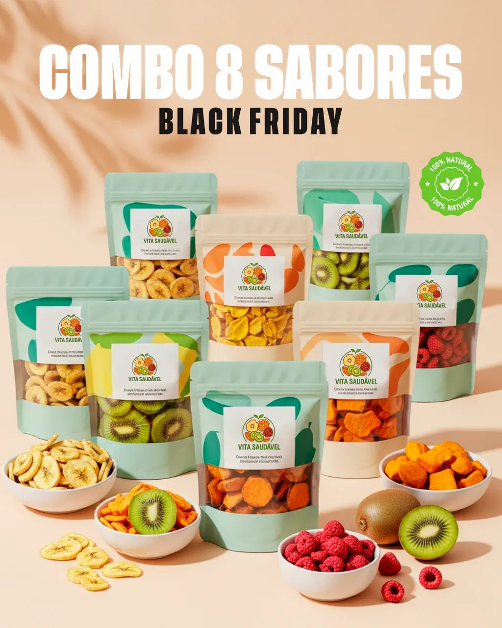 O Combo Vita Saudável com 8 sabores traz o melhor das frutas e vegetais desidratados para quem busca praticidade, sabor e ingredientes naturais no dia a dia.
